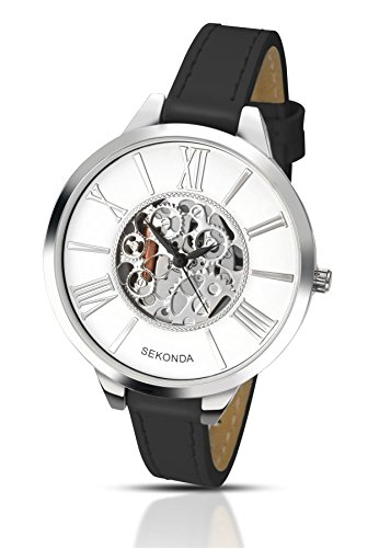 This ladies Sekonda watch has a stainless steel case and is powered by a quartz movement. It is fastened with a black leather strap and has a skeleton dial.