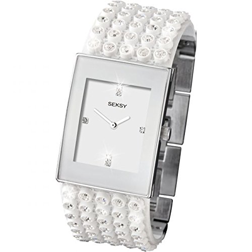 Seksy Ladies Bling Watch. Japanese Quartz Movement. White Rectangular Dial. Water Resistant. Stainless Steel case & Steel Case Back. Case Size: 27mm x 36mm. White Resin Strap with Crystals. Stainless Steel Jewellery Clasp with Two Self-Removable Links. Band Width: 27mm. This Seksy Bling 4853.37 Comes with Two Years Seksy by Sekonda Limited Warranty and a Box.