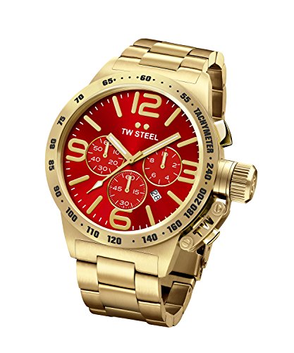 TW Steel CB113 Canteen chronograph men's watch features a 45mm wide and 12mm thick yellow gold plated solid stainless steel case with a fixed bezel and textured push-pull crown with function pushers. TW Steel CB113 is powered by an accurate Miyota 6S20 quartz chronograph movement. This stylish watch also features a shiny sunray red dial with white accents gold tone luminous hands and hour markers along with the chronograph and date display functions, scratch resistant sapphire coated mineral crystal and water resistant to 100 meters. TW Steel CB113 is equipped with a 20mm wide yellow gold plated solid stainless steel bracelet with a fold over clasp. TW Steel CB113 men's Canteen red dial yellow gold plated steel bracelet chronograph watch is brand new and comes in an original TW Steel gift box and is backed by a 2 years limited warranty.